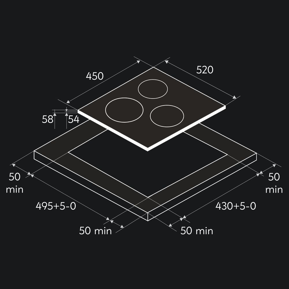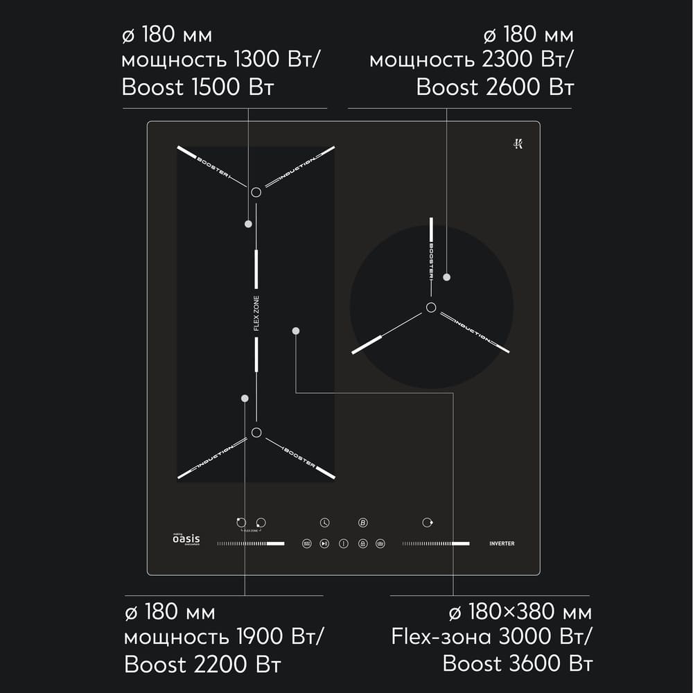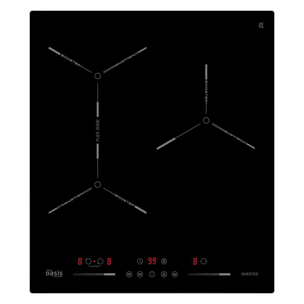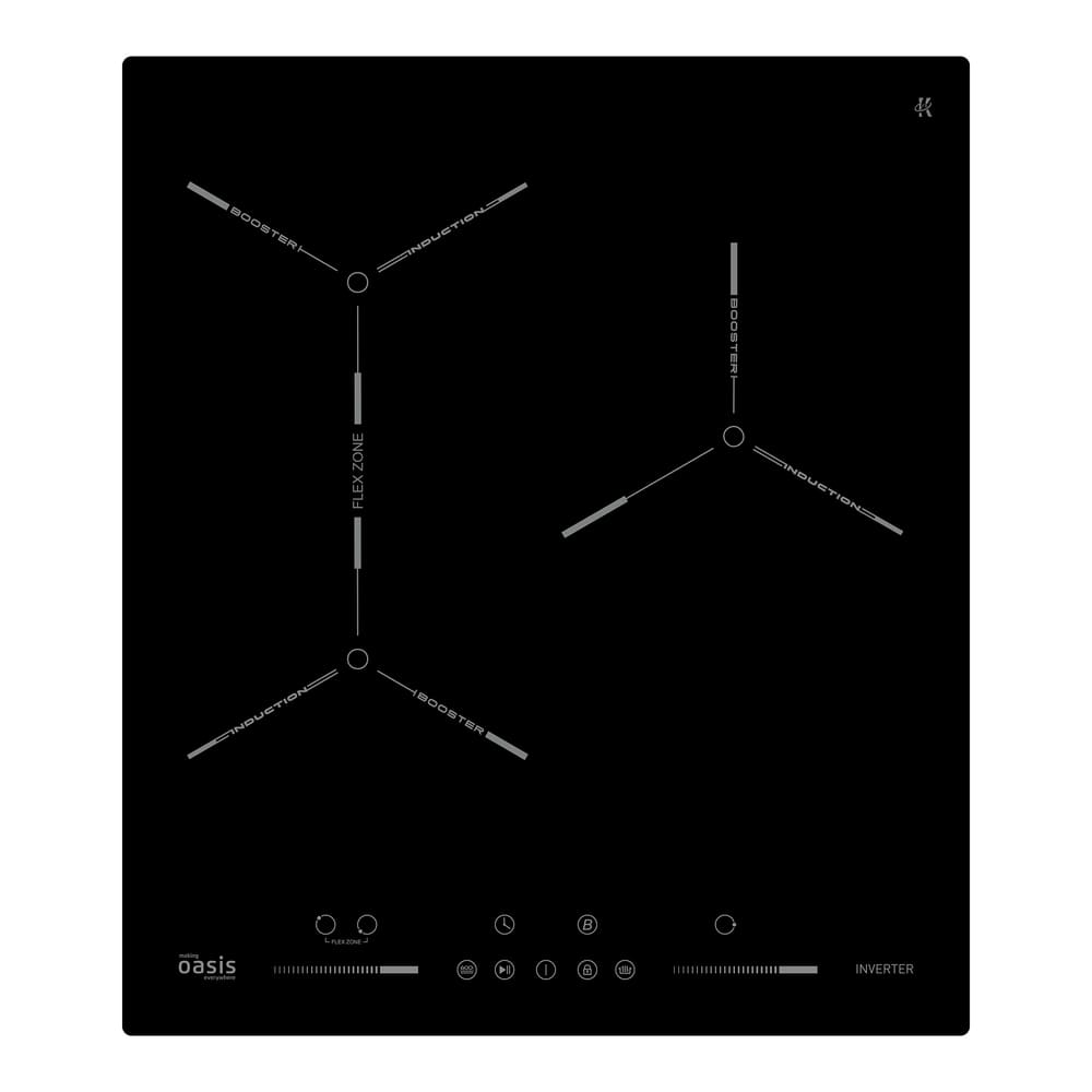 OASIS P-EBG — индукционная варочная панель шириной 45 см с 3-мя конфорками, функцией Booster, Flex-зоной, сенсорным управлением, функцией непрерывного инверторного нагрева и защитой от перегрева . Компактная, мощная и безопасная — идеально подходит для современных кухонь с ограниченным пространством.