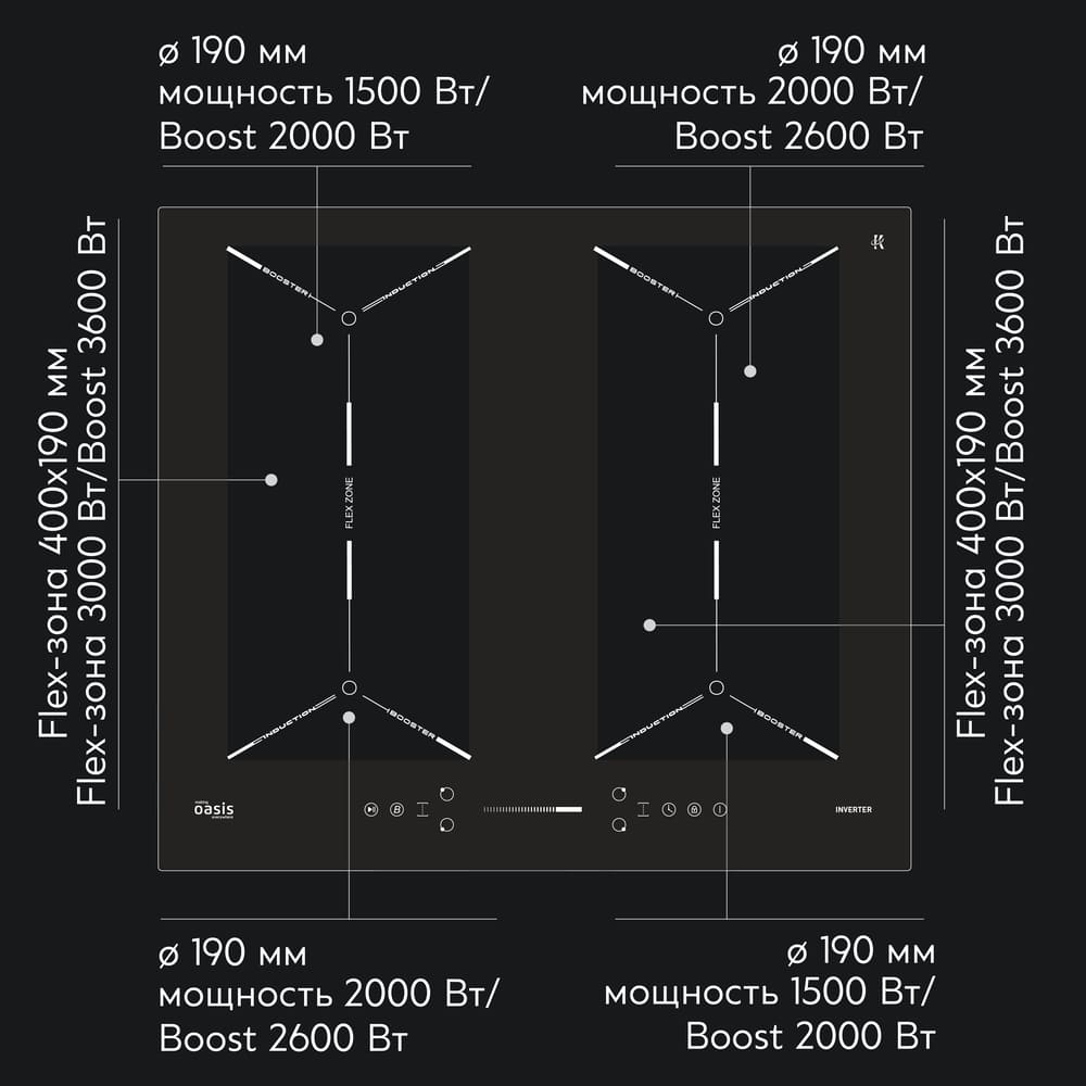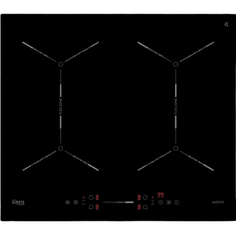 OASIS P-EIGD — индукционная варочная панель 60 см с 4 конфорками, мостовой зоной нагрева, 2-мя Flex-зонами и сенсорным управлением. Мощность 7200 Вт, функция Booster, защита от перегрева, индикация остаточного тепла и непрерывный инверторный нагрев — идеальный выбор для современной кухни.