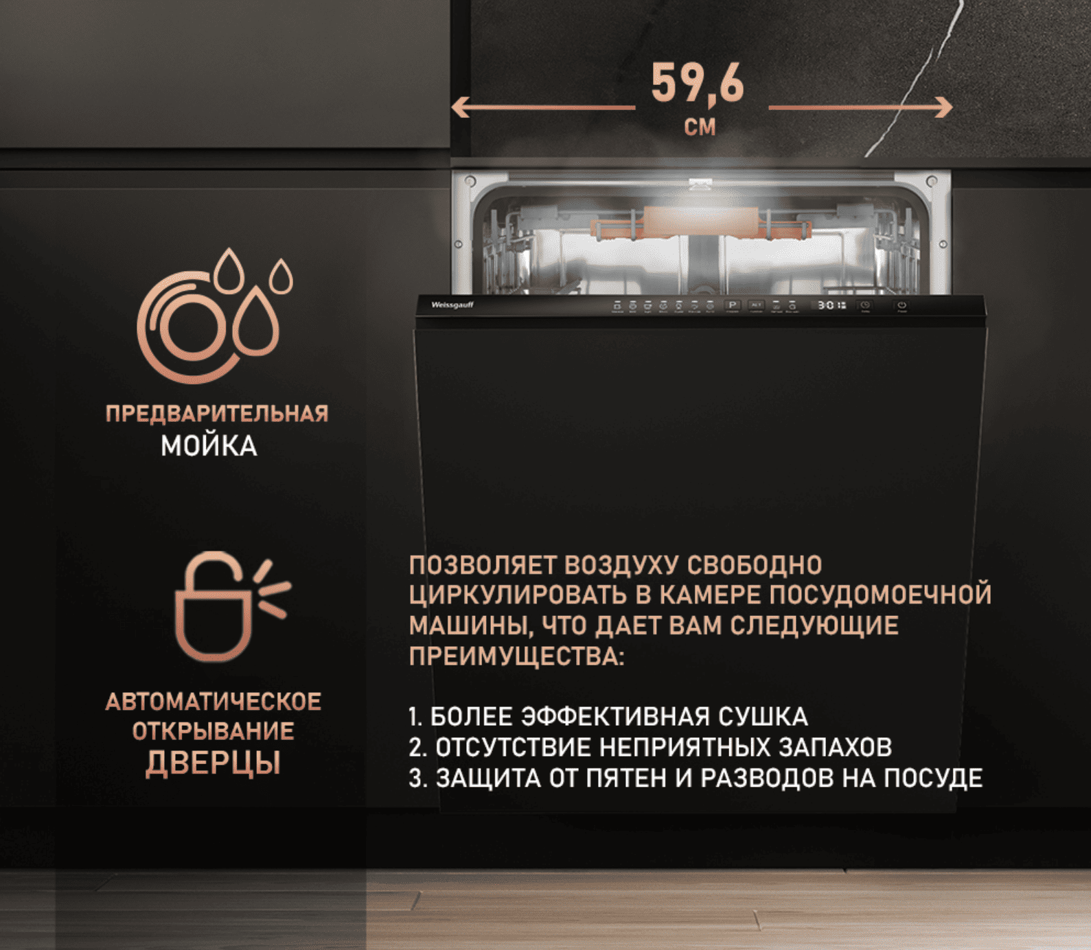 Откройте для себя идеальное сочетание технологий, комфорта и немецкого качества. Weissgauff BDW 6037 — это полноразмерная встраиваемая модель на 15 комплектов посуды, созданная для тех, кто ценит эффективность, тишину и стиль.
